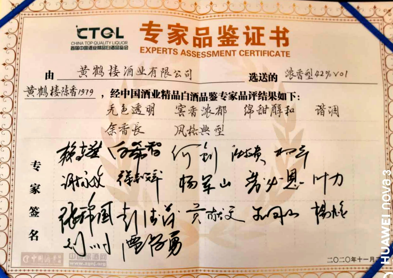 11月2日,首屆中國酒業(yè)精品白酒品鑒會在陜西西安召開,中國著名白酒專家賴高淮、白希智、何釗、丁易初、謝義貴、賈智勇、楊平、劉明、楊大金、王鳳仙、謝永文、葉力、徐欽祥、貢獻文、普必恩、趙德義、楊軍山、張鋒國共計18位名酒品鑒專家參加活動?;顒渝噙x出20款精品白酒并頒發(fā)專家品鑒證書,黃鶴樓酒•陳香1979名列其中,并以其 “無色透明、窖香濃郁、綿甜醇和、諧調(diào)、余香長、風格典型”的特點獲得品鑒專家們高度評價。