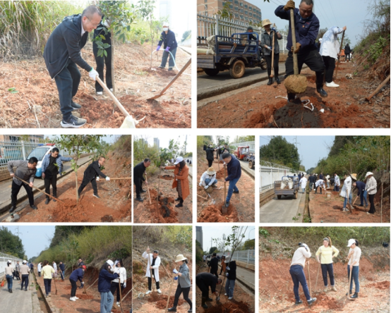 活動中,大家利用鋤頭、鐵鍬等工具,挖坑、放樹苗、填土、澆水、培土,相互配合、齊心協(xié)力,經(jīng)過不斷努力,將近百棵樹苗成功栽種,一株株桂花樹幼苗挺拔于春風中,傳遞著黃鶴樓酒的品牌生機與活力。